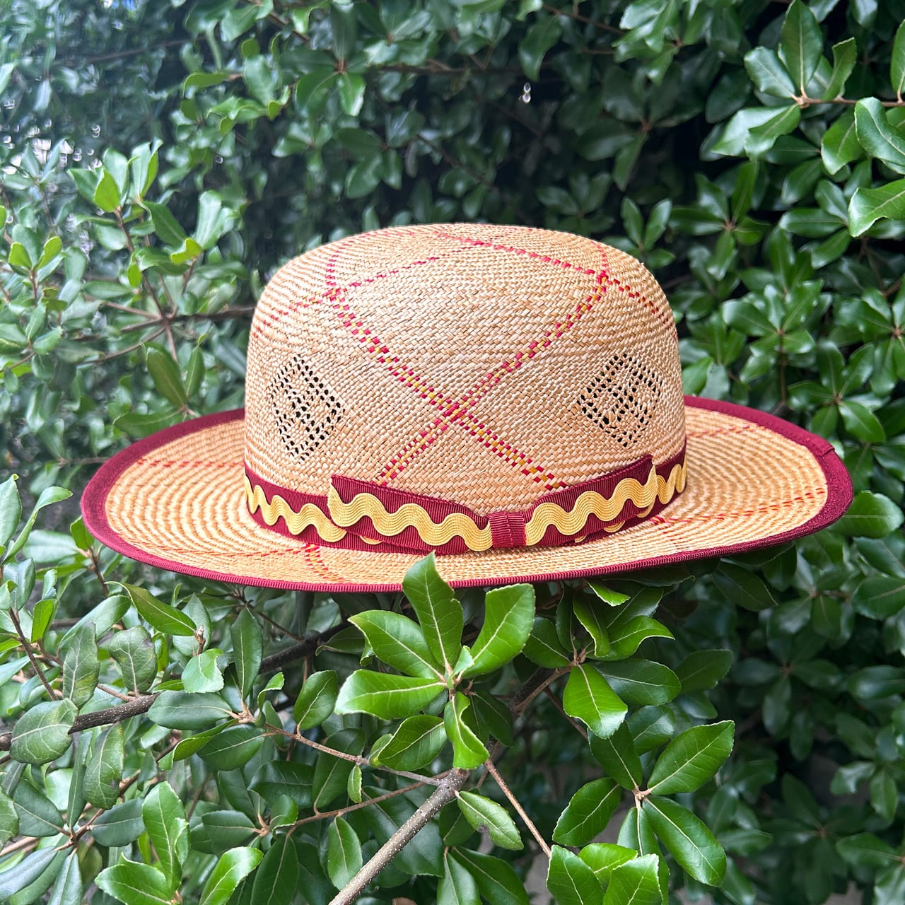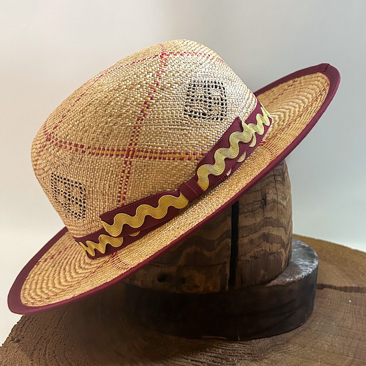ブリムのパイピングとリボンの色をバーガンディに合わせました。